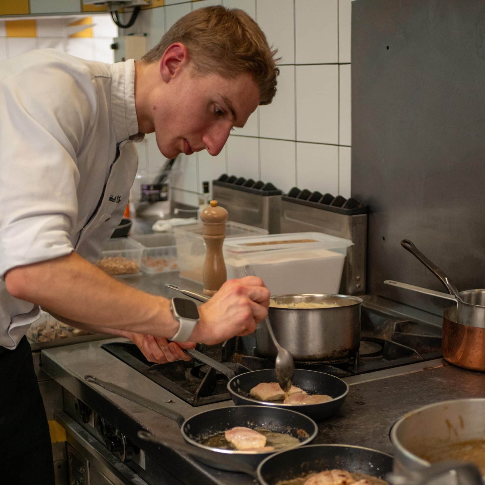 En cuisine, notre équipe travaille chaque jour avec précision et passion pour sublimer les produits de saison et proposer une cuisine sincère, soignée et pleine de caractère.